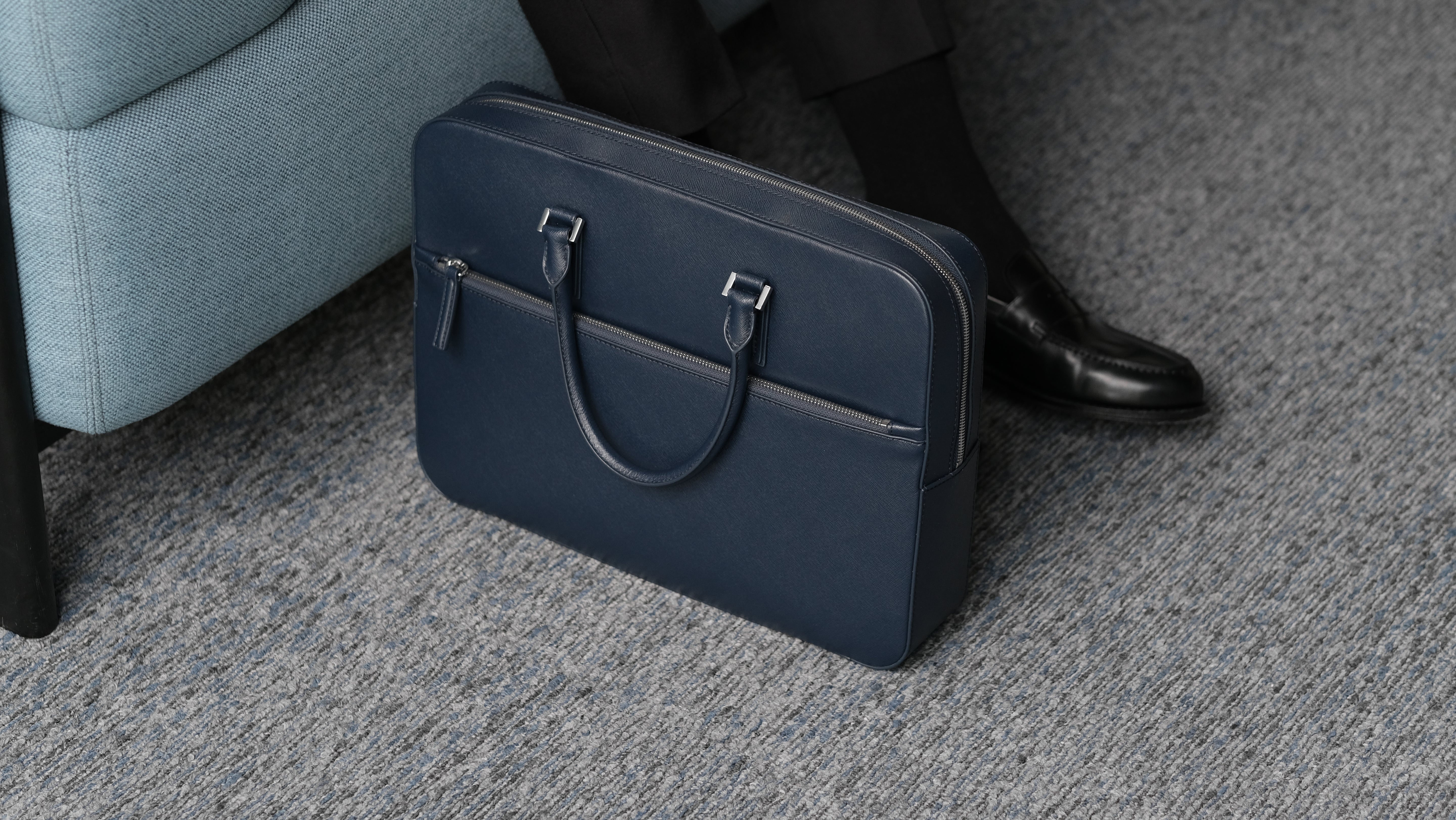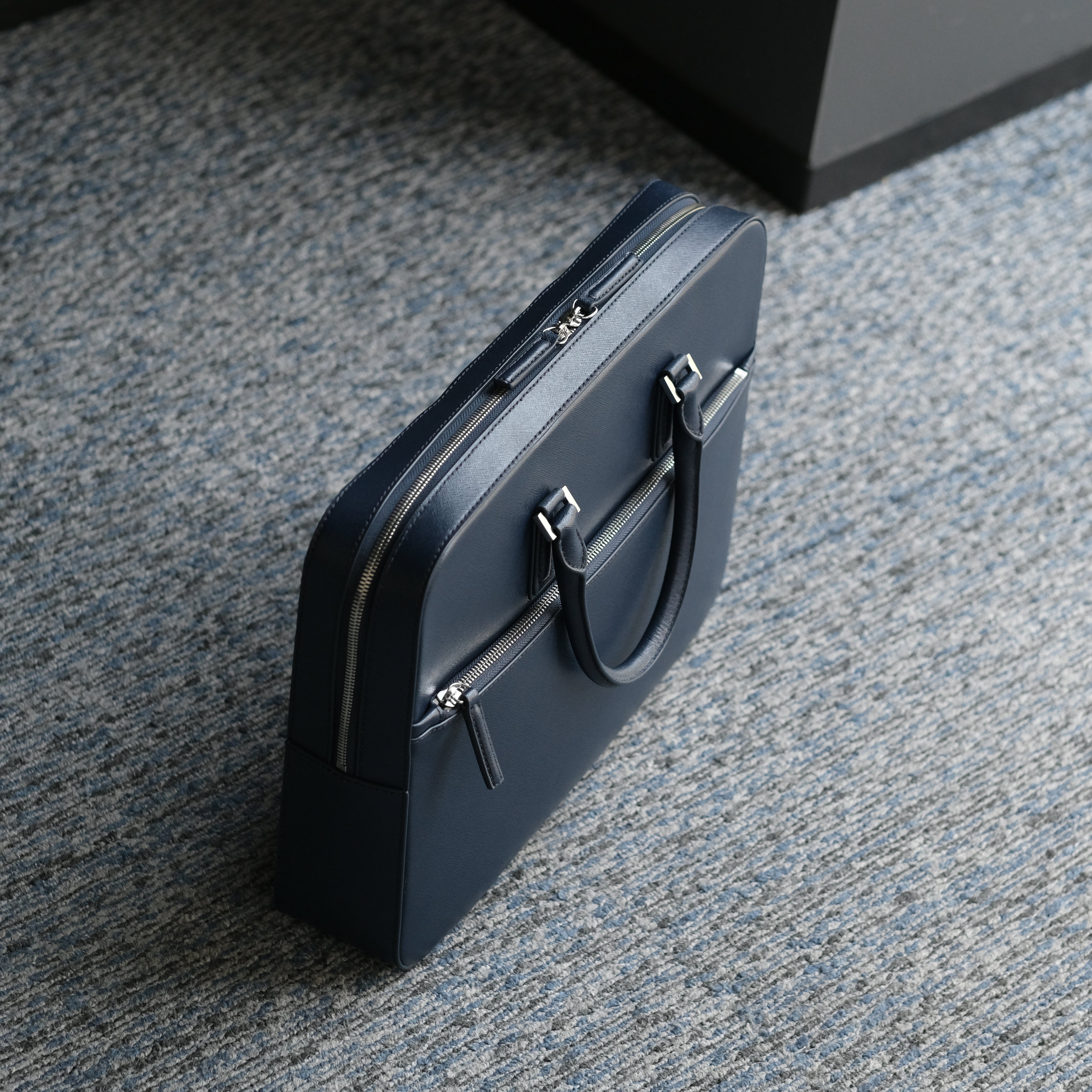 シンプルな装いながら使い勝手も良さを考慮して、ブリーフケースにフロントのジッパー(片面)をプラス。耐久性と上品な艶が特徴の独自ジッパーを使用ジッパーを使用しており、どの方向から見ても美しいと感じるように細部までこだわりを持って作っています。上品な艶がラグジュアリーを感じさせ、ワンランク上の装いに。