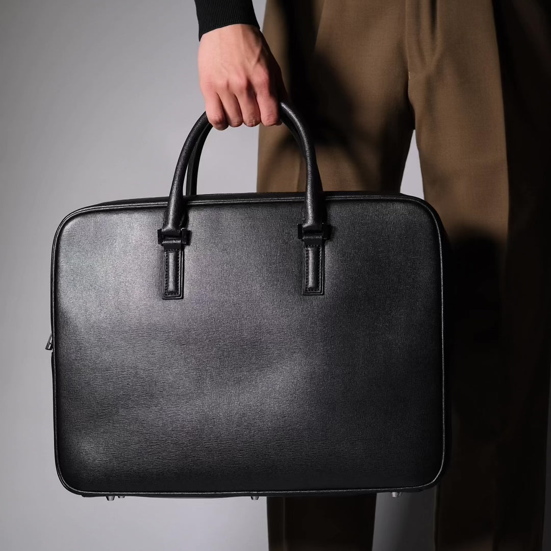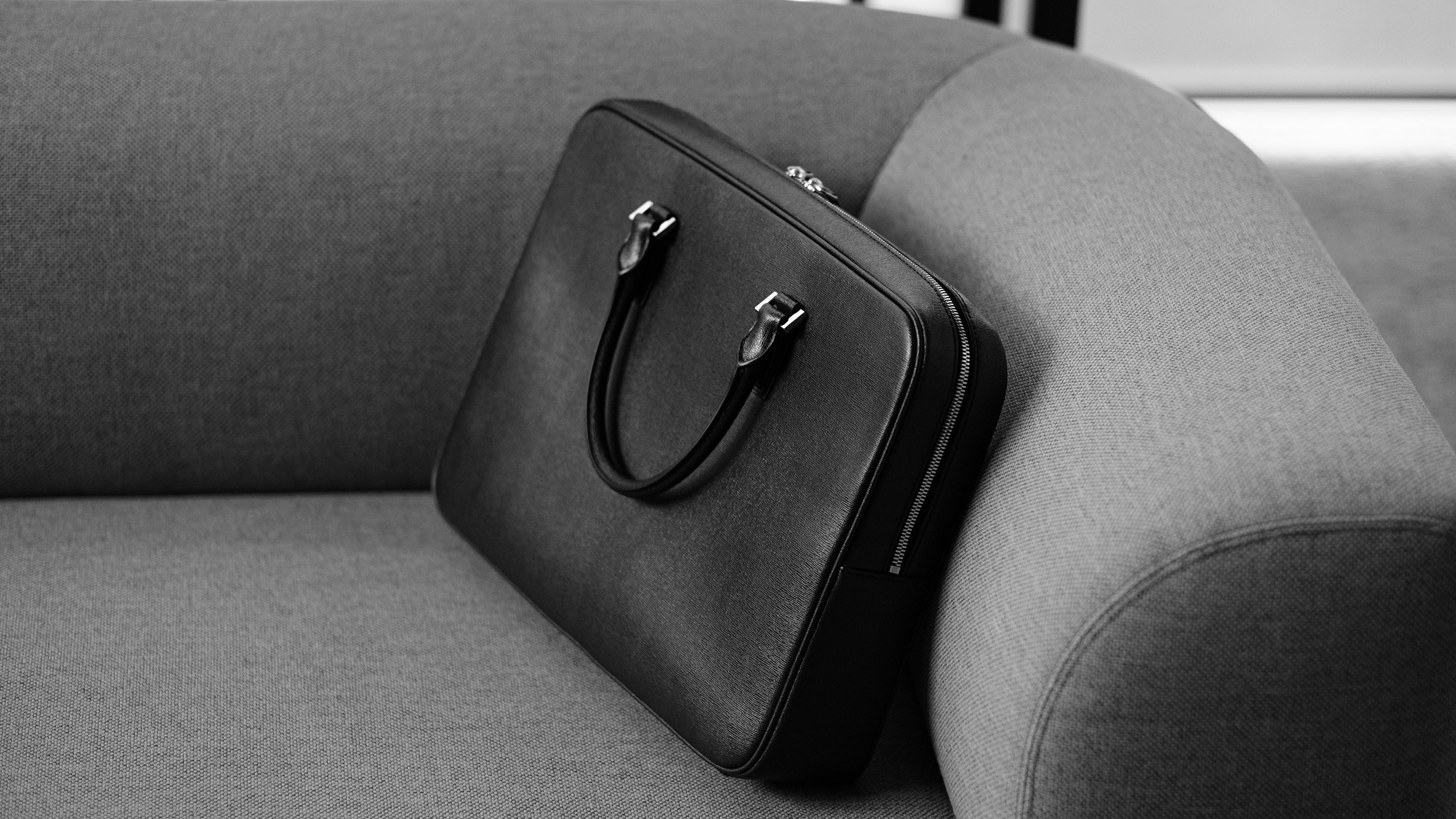 가볍고 내구성이 뛰어난 브리프케이스. 이탈리아산 사피아노 가죽은 미세하고 독특한 줄무늬가 있는 소가죽으로 스크래치나 얼룩이 잘 생기지 않고 내구성이 강한 소재다.