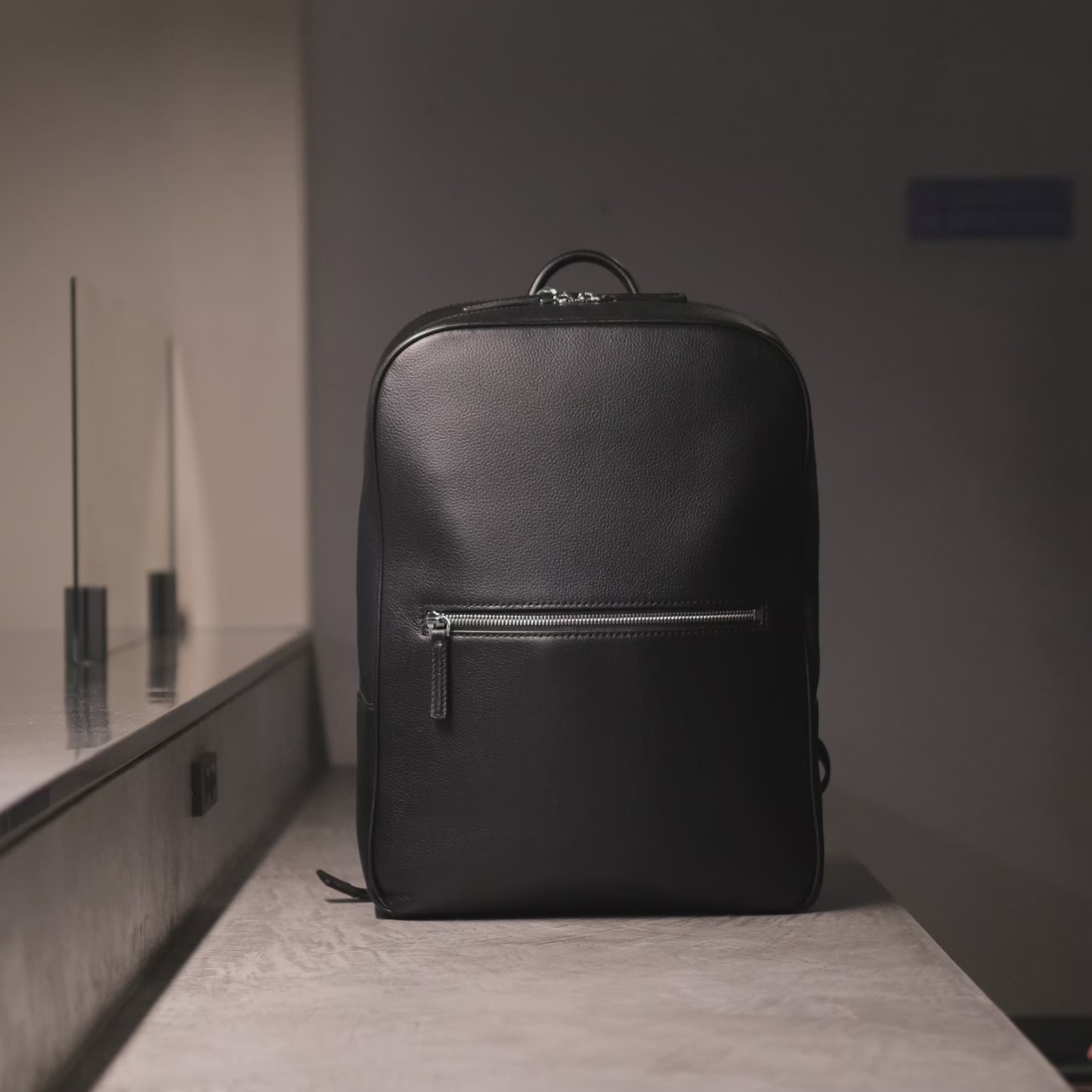 フルグレインレザーを使用し、シンプルで上品なデザインのバックパック。